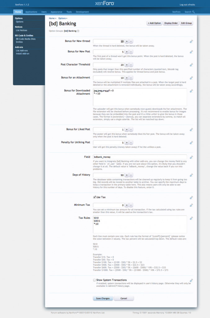 兼容版本: 1.5 1. 发布主题、回帖、获赞、上传附件等积分策略。 2. 支持导入的积分系统: vBCredits I, vBCredits II, kBank 3. 自定义社区银行 URL 地址。 4. 附件消耗积分,作者可自定义。 5. 移除原版自动检查更新功能 ps.这个作者的插件认可度非常高,70%汉化,继续完善中。推荐!